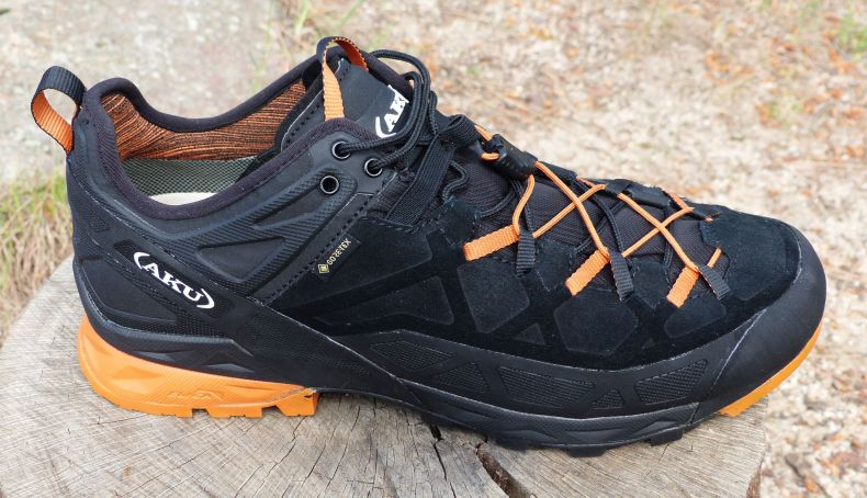 Ésta es una de esas raras ocasiones en las que una estética muy lograda viene acompañada de unos resultados reales a la altura. Nunca habíamos visto una zapatilla cófortable con una puntera tan precisa, lo que aumenta la seguridad en los tramos rocosos tanto en trabajo frontal como lateral. La horma es excepcional y con una comodidad sorprendente, algo nada fácil de conseguir con una puntera de perfil bajo, un 25% menos alta de lo habitual, idónea para terrenos complejos y sobre pequeños apoyos. El interior de la puntera ofrece una bóveda asimétrica que alberga con comodidad los dedos de cualquier pie medio o medio-ancho, el tallaje no es constrictivo (el nº42 admite sin problemas un 42½) y el nuevo sistema de doble atado de AKU (Dual Fit System) funciona muy bien y tiene importantes ventajas: la tradicional sujeción basada en tiras anchas en V resulta eficaz y duradera para caminar durante muchas horas seguidas, y el lazado rápido de encima se ajusta mediante mini-tanka ciñendo la mitad delantera de la zapatilla en terrenos difíciles, tramos rocosos semiverticales, crestas o vías ferrata. Al calzarnos la zapatilla, la lengüeta tiende a arrugarse por debajo del logotipo, pero puede resituarse fácilmente traccionando de su amplio y eficaz tirador.