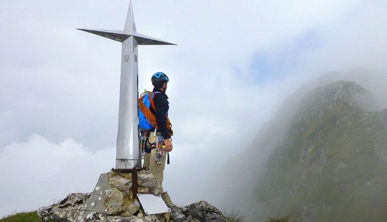 Los deportes de montaña tienen un componente de riesgo que otorga un irresistible atractivo de aventura a las actividades montañeras en cualquier cordillera del planeta, con mayor o menor intensidad según el aislamiento, la altitud, las dificultades técnicas y las condiciones climatológicas. Y los montañeros siempre buscamos los límites que se acercan a esa línea de emociones intensas e imprevisibles, necesitamos sentir la aventura que existe en las actividades montañeras y en ocasiones hay que subir el listón para alcanzar el mayor nivel de satisfacción en el camino de la cumbre. El Larrunarri (1.346 m), conocido popularmente como Txindoki, es una cumbre de leyenda en la sierra guipuzcoana de Aralar, centro de megalitos y ritos ancestrales en las culturas rurales vascas. La cresta oeste es un itinerario clásico de “montañismo de vértigo”, cuando es necesario usar material de escalada para progresar por crestas aéreas con cuerdas, montar reuniones y trepar y destrepar por muros fisurados, grietas y espolones con abismos en los lados. Los escaladores no suelen considerar la cresta del Txindoki una escalada “al uso” porque el paso de mayor dificultad es IV+, pero los montañeros que están dando los primeros pasos en el mundo de la escalada van a disfrutar un recorrido precioso, panorámico y emocionante, combinando senderismo, montañismo y escalada clásica. La vía de escalada tiene 350 metros (AD+/III-IV+), tiene siete largos, las reuniones están equipadas y las placas tienen seguros fijos, aunque es recomendable llevar un juego de fisureros. En algunas grietas aparecen clavos antiguos que sirven para asegurar y marcan la línea de la vía.